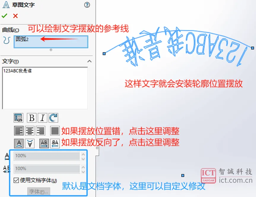 写入文字后,如果需要调整文字位置方向,可以绘制文字摆放的参考线,这样文字就会按照轮廓位置摆放,如果位置摆放错了或者方向反了,可以点击如下图位置进行调整,文档字体也可以进行自定义修改。