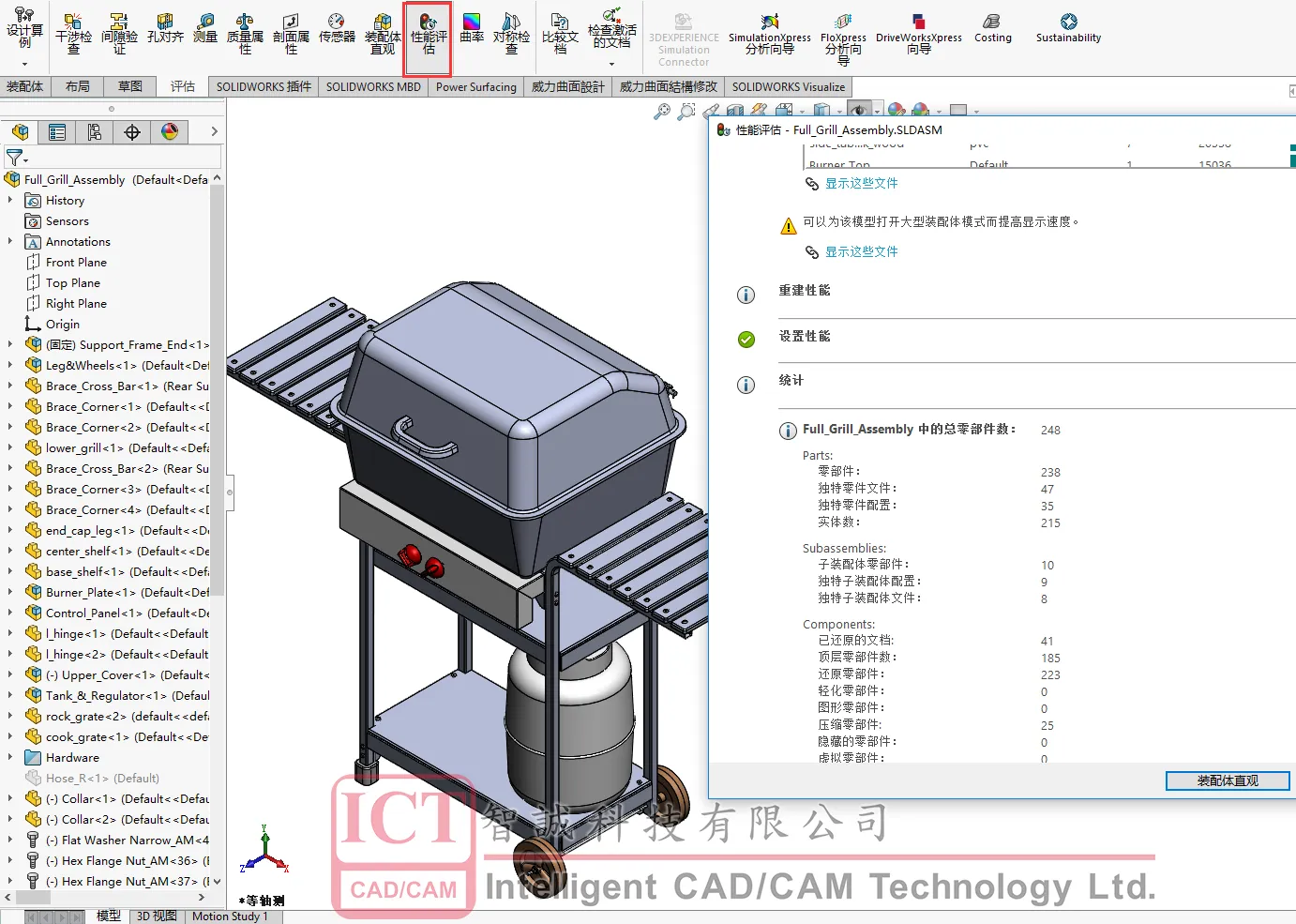 打开一个模型,通过性能评估可以查看到其具体零件数量