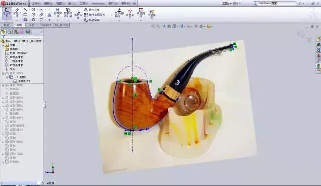 1) 选择一基准面,创建草图1,单击工具—草图工具—草图图片,找到烟斗的效果图插入,并在属性栏中调整图片的大小和位置。