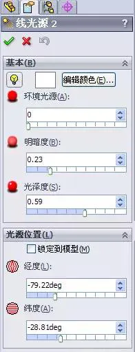 为了使图片显示的更加真实,我们可以利用灯光或投影增加图片的立体感和效果。选择模型树中的“光源、相机与布景”,点击右键添加适当的环境光源、线光源、聚光源及点光源等。并调整灯光的属性数值,例如明暗度、光泽度,达到不同的显示效果,然后设定光源的位置即经度、纬度等。图示是线光源的明暗度及位置参数。