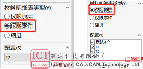 原因:‘仅限零件’或者‘缩进’的材料明细表的配置只能选择一个,而‘仅限顶层‘的派生配置多个共存。