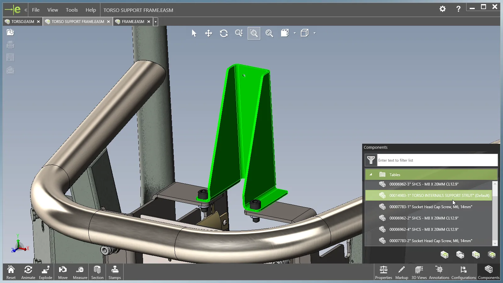 目前eDrawings能直接打开SOLIDWORKS的模型,但不能显示正确的爆炸效果,这是一个bug;在未来版本中可能会被修复。可以使用传统方法解决该问题:将SOLIDWORKS模型另存为eDrawings格式的文件(.EASM),再使用eDrawings打开即可得到正确的爆炸效果,如下图: