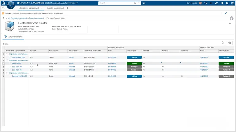 建立工程和采购之间的联系。简化外部零部件引入、审批和认证流程。创建并评估采购零部件的资质。