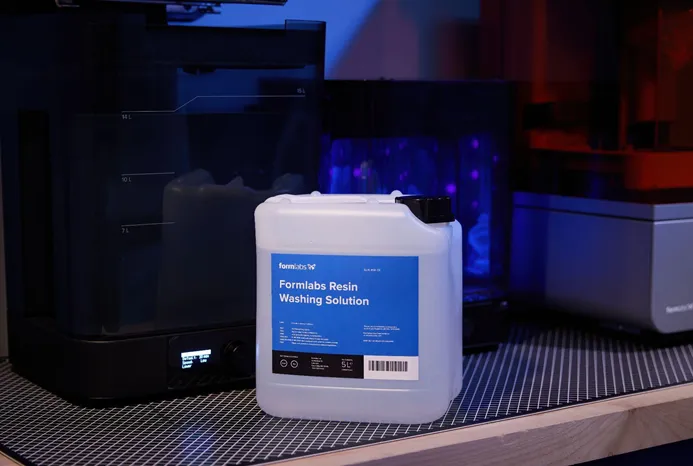 使用新一代部件清洗液 Formlabs Resin Washing Solution(树脂清洗液)清洗 3D 打印部件,其清洁效果不亚于 IPA,且不易燃(根据 GHS 类别),可安全用于任何工作场所。这种清洗液的使用寿命是 IPA 的两倍,蒸发性低,气味极小,从而减少了清洗补充量和单次清洗成本。